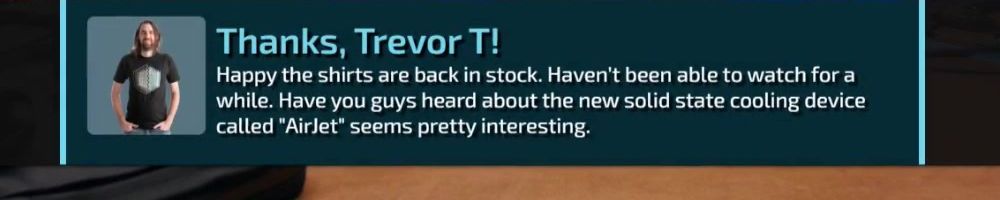 Happy the shirts are back in stock. Haven't been able to watch for a while. Have you guys heard about the new solid state cooling device called "AirJet" seems pretty interesting.