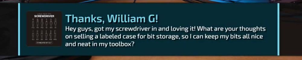 Hey guys, got my screwdriver in and loving it! What are your thoughts on selling a labeled case for bit storage, so I can keep my bits all nice and neat in my toolbox?