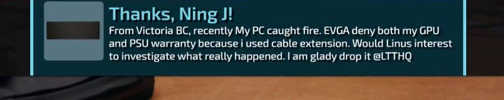 From Victoria BC, recently My PC caught fire. EVGA deny both my GPU and PSU warranty because i used cable extension. Would Linus interest to investigate what really happened. I am glady drop it @LTTHQ