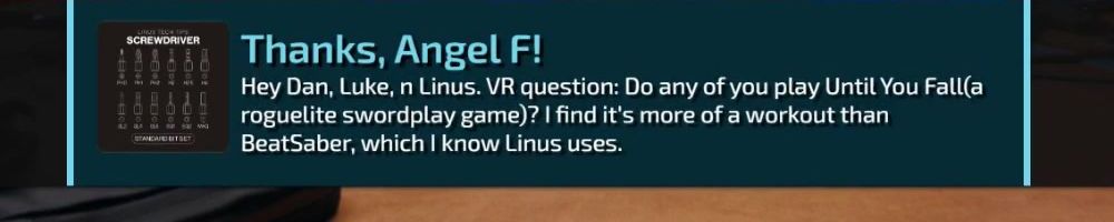 Hey Dan, Luke, n Linus. VR question: Do any of you play Until You Fall(a roguelite swordplay game)? I find it's more of a workout than BeatSaber, which I know Linus uses.