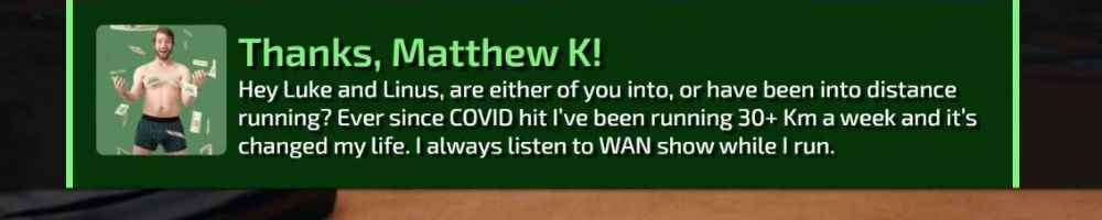 Hey Luke and Linus, are either of you into, or have been into distance running? Ever since COVID hit I've been running 30+ Km a week and it's changed my life. I always listen to WAN show while I run.