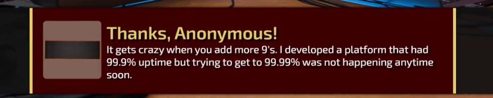 It gets crazy when you add more 9's. I developed a platform that had 99.9% uptime but trying to get to 99.99% was not happening anytime soon.