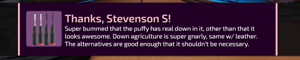 Super bummed that the puffy has real down in it, other than that it looks awesome. Down agriculture is super gnarly, same w/ leather. The alternatives are good enough that it shouldn't be necessary.