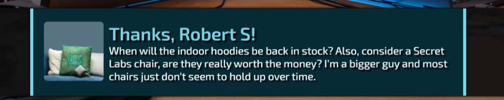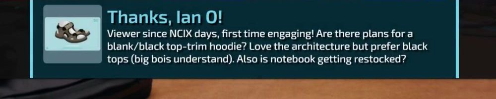 Viewer since NCIX days, first time engaging! Are there plans for a blank/black top-trim hoodie? Love the architecture but prefer black tops (big bois understand). Also is notebook getting restocked?