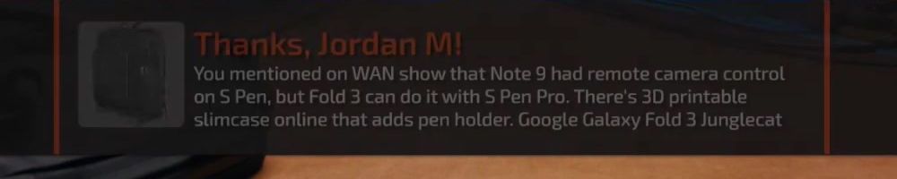You mentioned on WAN show that Note 9 had remote camera control on S Pen, but Fold 3 can do it with S Pen Pro. There's 3D printable slimcase online that adds pen holder. Google Galaxy Fold 3 Junglecat
