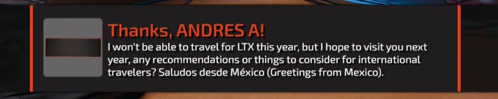 I won't be able to travel for LTX this year, but I hope to visit you next year, any recommendations or things to consider for international travelers? Saludos desde México (Greetings from Mexico).