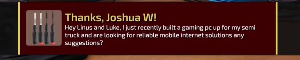 Hey Linus and Luke, I just recently built a gaming pc up for my semi truck and are looking for reliable mobile internet solutions any suggestions?