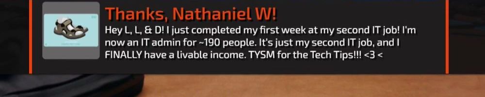 Hey L, L, & D! I just completed my first week at my second IT job! I'm now an IT admin for ~190 people. It's just my second IT job, and I FINALLY have a livable income. TYSM for the Tech Tips!!! <3 <