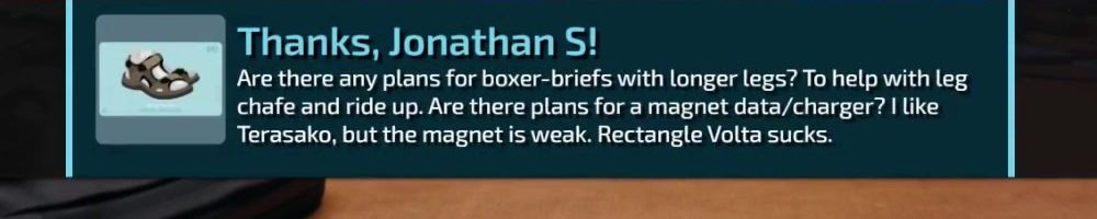 Are there any plans for boxer-briefs with longer legs? To help with leg chafe and ride up. Are there plans for a magnet data/charger? I like Terasako, but the magnet is weak. Rectangle Volta sucks.