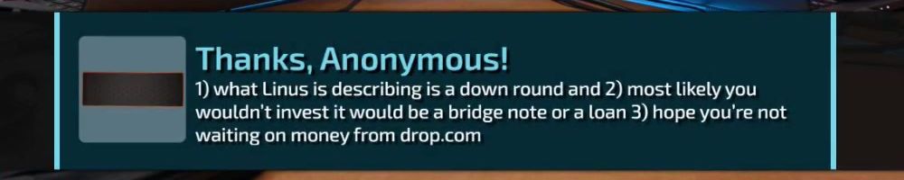 1) what Linus is describing is a down round and 2) most likely you wouldn't invest it would be a bridge note or a loan 3) hope you're not waiting on money from drop.com