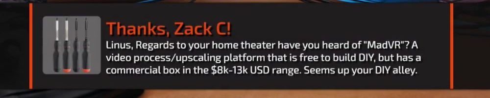 Linus, Regards to your home theater have you heard of "MadVR"? A video process/upscaling platform that is free to build DIY, but has a commercial box in the $8k-13k USD range. Seems up your DIY alley.