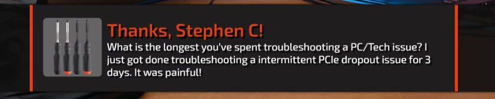 What is the longest you've spent troubleshooting a PC/Tech issue? I just got done troubleshooting a intermittent PCIe dropout issue for 3 days. It was painful!