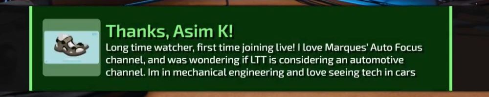 Long time watcher, first time joining live! I love Marques' Auto Focus channel, and was wondering if LTT is considering an automotive channel. Im in mechanical engineering and love seeing tech in cars