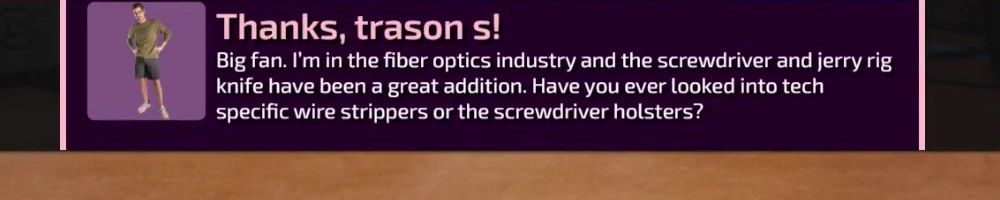 Big fan. I'm in the fiber optics industry and the screwdriver and jerry rig knife have been a great addition. Have you ever looked into tech specific wire strippers or the screwdriver holsters?