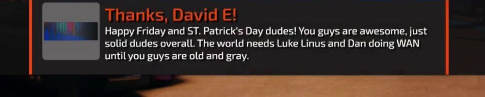 Happy Friday and ST. Patrick's Day dudes! You guys are awesome, just solid dudes overall. The world needs Luke Linus and Dan doing WAN until you guys are old and gray.