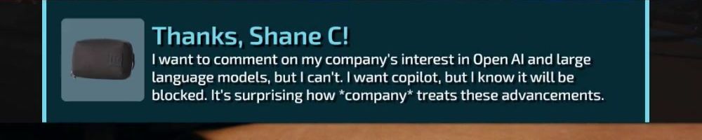 I want to comment on my company's interest in Open AI and large language models, but I can't. I want copilot, but I know it will be blocked. It's surprising how *company* treats these advancements.