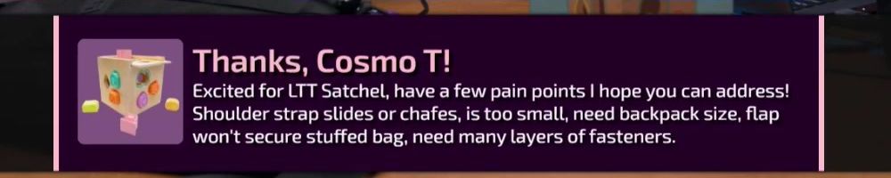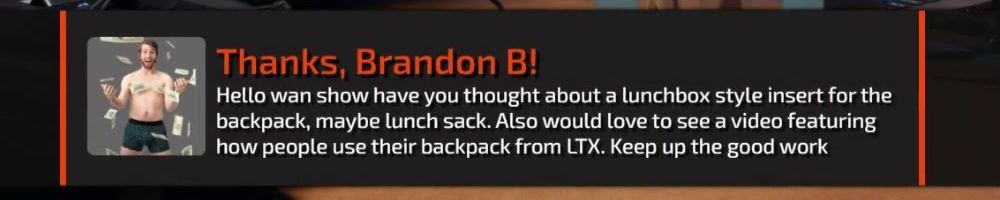 Hello wan show have you thought about a lunchbox style insert for the backpack, maybe lunch sack. Also would love to see a video featuring how people use their backpack from LTX. Keep up the good work