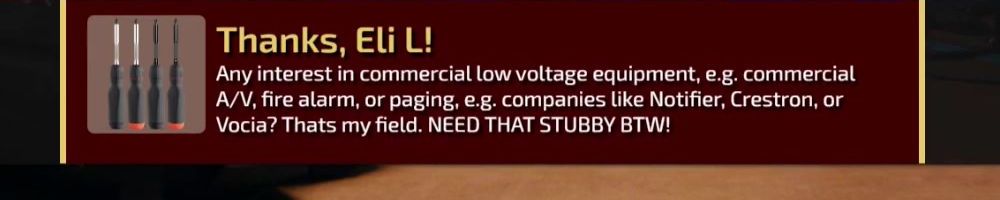Any interest in commercial low voltage equipment, e.g. commercial A/V, fire alarm, or paging, e.g. companies like Notifier, Crestron, or Vocia? Thats my field. NEED THAT STUBBY BTW!
