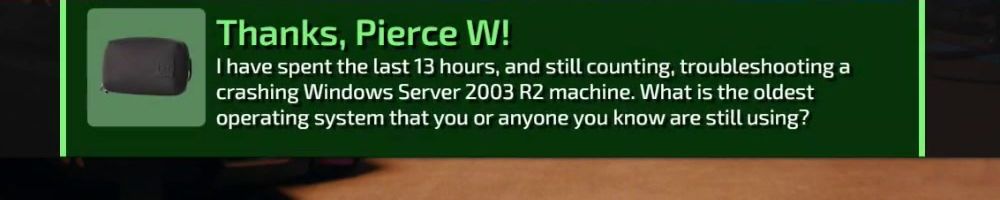 I have spent the last 13 hours, and still counting, troubleshooting a crashing Windows Server 2003 R2 machine. What is the oldest operating system that you or anyone you know are still using?