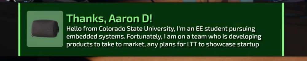 Hello from Colorado State University, I'm an EE student pursuing embedded systems. Fortunately, I am on a team who is developing products to take to market, any plans for LTT to showcase startup