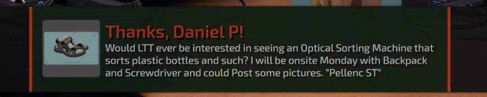 Would LTT ever be interested in seeing an Optical Sorting Machine that sorts plastic bottles and such? I will be onsite Monday with Backpack and Screwdriver and could Post some pictures. "Pellenc ST"