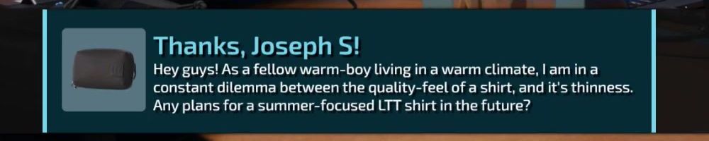 Hey guys! As a fellow warm-boy living in a warm climate, I am in a constant dilemma between the quality-feel of a shirt, and it's thinness. Any plans for a summer-focused LTT shirt in the future?