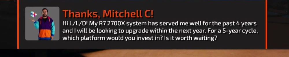 Hi L/L/D! My R7 2700X system has served me well for the past 4 years and I will be looking to upgrade within the next year. For a 5-year cycle, which platform would you invest in? Is it worth waiting?