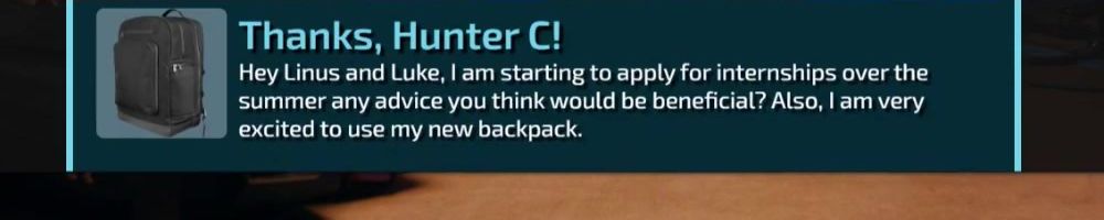 Hey Linus and Luke, I am starting to apply for internships over the summer any advice you think would be beneficial? Also, I am very excited to use my new backpack.