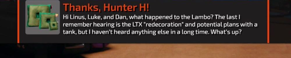 Hi Linus, Luke, and Dan, what happened to the Lambo? The last I remember hearing is the LTX "redecoration" and potential plans with a tank, but I haven't heard anything else in a long time. What's up?