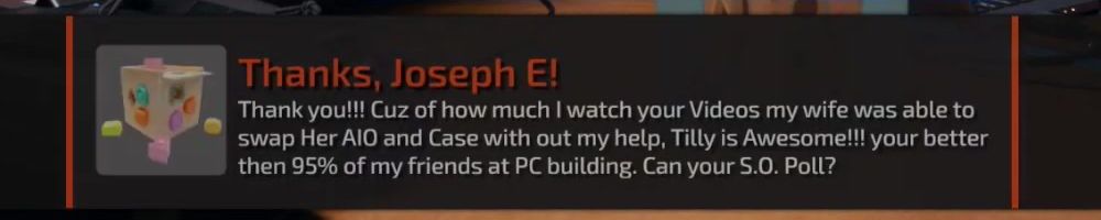 Thank you!!! Cuz of how much I watch your Videos my wife was able to swap Her AIO and Case with out my help, Tilly is Awesome!!! your better then 95% of my friends at PC building. Can your 5.0. Poll?