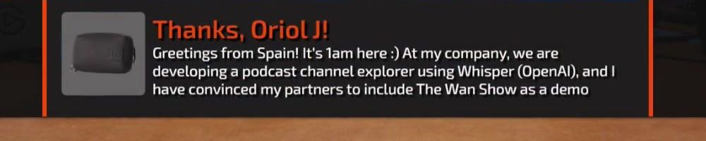Greetings from Spain! It's 1am here :) At my company, we are developing a podcast channel explorer using Whisper (OpenAI), and I have convinced my partners to include The Wan Show as a demo