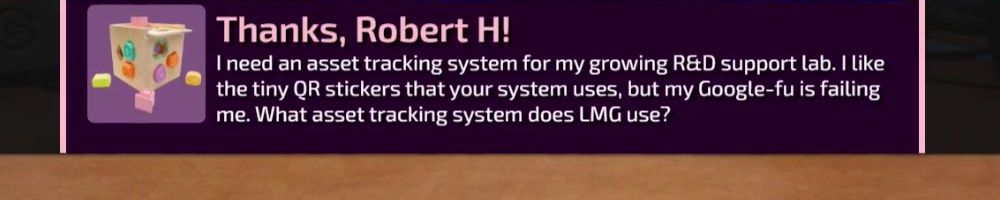 I need an asset tracking system for my growing R&D support lab. I like the tiny QR stickers that your system uses, but my Google-fu is failing me. What asset tracking system does LMG use?