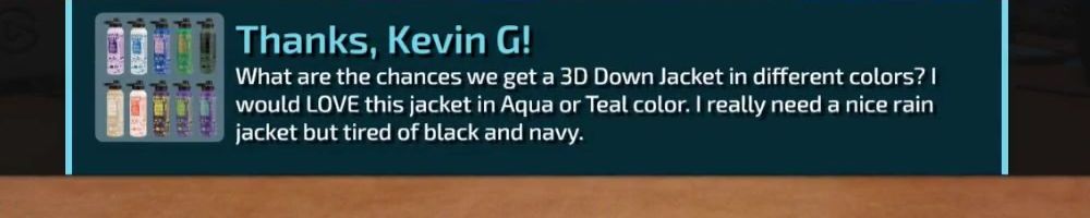 What are the chances we get a 3D Down Jacket in different colors? I would LOVE this jacket in Aqua or Teal color. I really need a nice rain jacket but tired of black and navy.