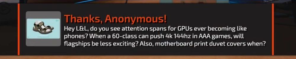 Hey L&L, do you see attention spans for GPUs ever becoming like phones? When a 60-class can push 4k 144hz in AAA games, will flagships be less exciting? Also, motherboard print duvet covers when?