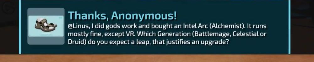 @Linus, I did gods work and bought an Intel Arc (Alchemist). It runs mostly fine, except VR. Which Generation (Battlemage, Celestial or Druid) do you expect a leap, that justifies an upgrade?