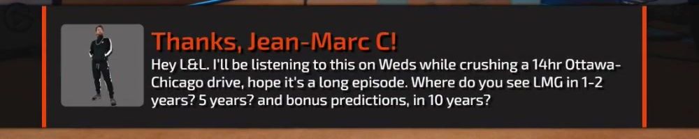 Chicago drive, hope it's a long episode. Where do you see LMG in 1-2