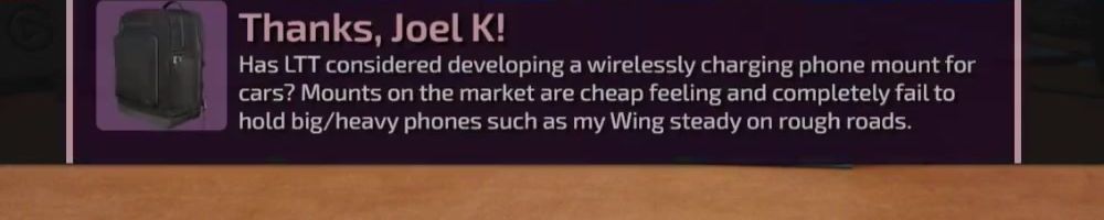 Has LTT considered developing a wirelessly charging phone mount for cars? Mounts on the market are cheap feeling and completely fail to hold big/heavy phones such as my Wing steady on rough roads.