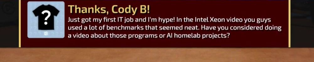 Just got my first IT job and I'm hype! In the Intel Xeon video you guys used a lot of benchmarks that seemed neat. Have you considered doing a video about those programs or AI homelab projects?