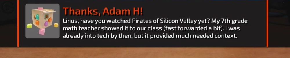 Linus, have you watched Pirates of Silicon Valley yet? My 7th grade math teacher showed it to our class (fast forwarded a bit). I was already into tech by then, but it provided much needed context.