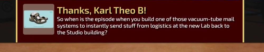 So when is the episode when you build one of those vacuum-tube mail systems to instantly send stuff from logistics at the new Lab back to the Studio building?
