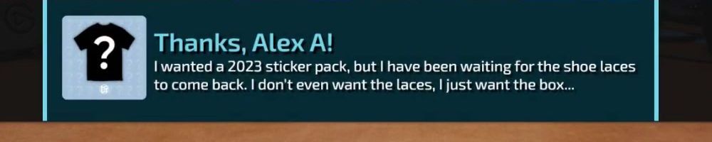 I wanted a 2023 sticker pack, but I have been waiting for the shoe laces to come back. I don't even want the laces, I just want the box...