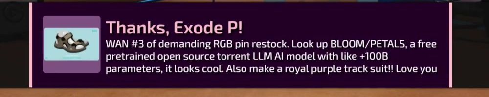 WAN #3 of demanding RGB pin restock. Look up BLOOM/PETALS, a free pretrained open source torrent LLM Al model with like +100B parameters, it looks cool. Also make a royal purple track suit!! Love you