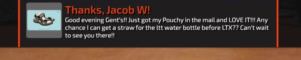 Good evening Gent's! Just got my Pouchy in the mail and LOVE IT!!! Any chance I can get a straw for the ltt water bottle before LTX?? Can't wait to see you there!!