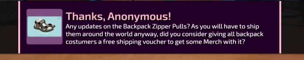 Any updates on the Backpack Zipper Pulls? As you will have to ship them around the world anyway, did you consider giving all backpack costumers a free shipping voucher to get some Merch with it?