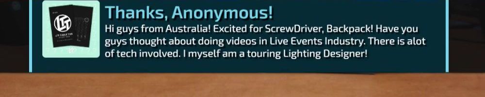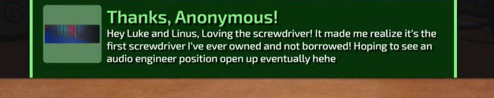 Hey Luke and Linus, Loving the screwdriver! It made me realize it's the first screwdriver I've ever owned and not borrowed! Hoping to see an audio engineer position open up eventually hehe
