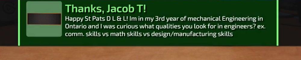 Happy St Pats D L & L! Im in my 3rd year of mechanical Engineering in Ontario and I was curious what qualities you look for in engineers? ex. comm. skills vs math skills vs design/manufacturing skills