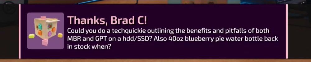 Could you do a techquickie outlining the benefits and pitfalls of both MBR and GPT on a hdd/SSD? Also 400z blueberry pie water bottle back in stock when?