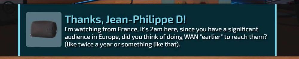 I'm watching from France, it's 2am here, since you have a significant audience in Europe, did you think of doing WAN "earlier" to reach them? (like twice a year or something like that).