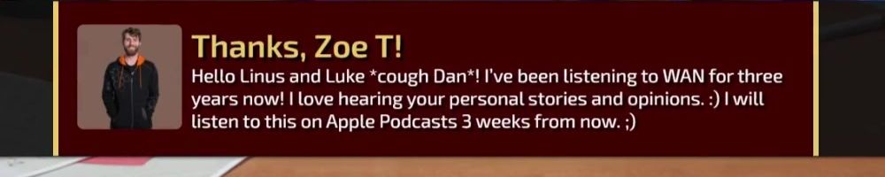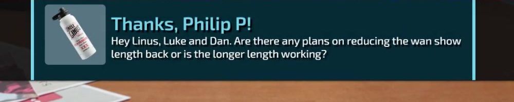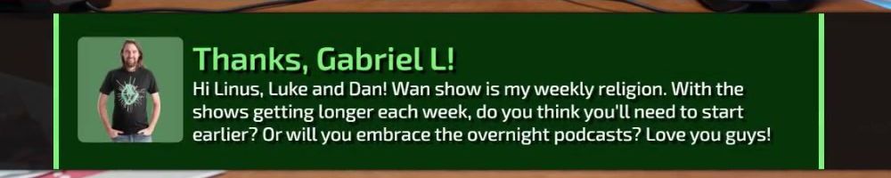 Hi Linus, Luke and Dan! Wan show is my weekly religion. With the shows getting longer each week, do you think you'll need to start earlier? Or will you embrace the overnight podcasts? Love you guys!