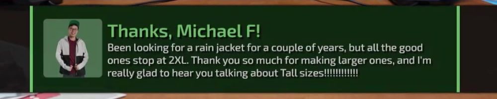Been looking for a rain jacket for a couple of years, but all the good ones stop at 2XL. Thank you so much for making larger ones, and I'm really glad to hear you talking about Tall sizes!!!!!!!!!!